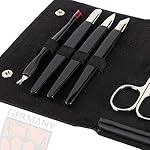 CASE: Fashion leather black, size ca. 15,5 x 11,5 x 3,0 cm. Our organizers are made of high-grade fashion or classic materials. Additional equipment: Microfiber cleaning cloth for cleaning steel items, general info sheet “Finger – Nail Grooming”.