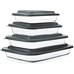 TIGHT FITTING LIDS: 8-piece baking dishes set includes 4 baking dishes and 4 gray BPA-free plastic tight fitting lids, which are designed to keep your food fresher longer. Made with a special non-slip design, you can stack these 4 containers with lids on top of each other in your fridge or freezer for space saving storage. Also they are sloshproof to prevent spilling while storing or on the go. The ideal set for baking, serving and storing food.