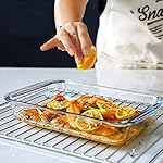ELEGANT DESIGN & CONVENIENT HANDLES: The clear glass baking pan makes a nice, attractive presentation for enjoyable baking time, a charming decoration in your dining table and kitchen. It also lets you monitor the baking process, serve your meals in a stylish and elegant fashion and easily identify leftovers. The edge of the bakeware is round and smooth, with a widened, thickened, and anti-scalding handle design, providing a secure grip while taking to and from the oven.