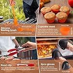 ?10 Pcs Air Fryer Kit: The accessories for air fryer include 2 silicone air fryer liner, 1 stainless steel grill rack, 1 stainless steel skewer rack with 4 skewers, 1 oil brush, 1 kitchen tong,2 Silicone Gloves,5 cupcake mold. It allows you to make a variety of delicacies at the same time, saving your time and energy