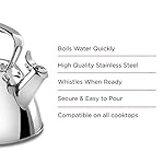 The All-Clad 2-Quart Tea Kettle quickly and efficiently boils water. Made from durable, high quality 18/10 stainless steel with a high-polished surface for easy cleaning. Whistles to alert when water is boiling, and hinged cap flips open for easy pouring. Comfortable, sloped handle is securely attached with stainless steel rivets. Compatible on all cooktops including gas, electric, ceramic, and induction.