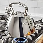 The hinged spout cap whistles to alert when water is boiling and flips open for easy, smooth pouring