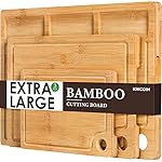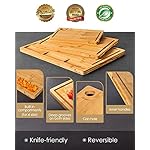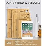 【Meet All Your Kitchen Needs】 Bamboo cutting board set includes 3 cutting boards of various sizes: an extra large size (17.0*12.6*0.78inch) with 3 built-in compartments; a large size (14.0*10.0 *0.7inch) suitable for vegetables; a medium size (10.0*7.0*0.7inch) suitable for fruit. Various sizes of bamboo boards can be used for different area.