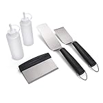 5-piece griddle tool set includes one spatula with cutting edge, one turning spatula, one chopping & scraping tools and two multi-purpose squirt bottles.
