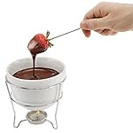 ? EVEN HEAT DISTRIBUTION WARMING POT – We recommend heating your white, milk or dark chocolate, or cheese sauce on the stove first. Transfer your mixture into the porcelain fondue bowl and light the tea light candle underneath. The even heat distribution keeps the chocolate or cheese at the perfect temperature for dipping!