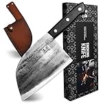 【Ergonomic Design & Convenient to Carry】The Full Tang handle and Triple-riveted design ensure comfort and maneuverability. This premium custom butcher knife comes with a special leather cover to protect the blade, can be easily attached to the belt which makes it more convenient to carry when camping, hiking, hunting, fishing and BBQ. It’s definitely your practical assistant no matter when you are indoor or outdoor, adding satisfaction and enjoyment of kitchen, outdoor experience.