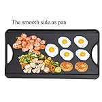 20 Inch x 10.5 Inch Big Grill Pan for Stovetop. Double play reversible griddle, both sides can be used, not only as a griddle, but also as a pan. The smooth side is great for making grilled cheese sandwiches, eggs and pancakes. The ribbed side is perfect for grilling foods such as steak, fish, chicken, hamburgers and others