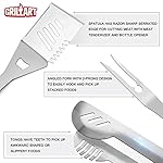 SPECIAL DESIGN – User-friendly is our main design purpose. Reinforced BBQ tongs can easily clip food and is not easy to bend. The spatula is a 4-in-1 multi tool, which includes slotted turner with tenderizer blades and built-in bottle opener. Elongated stainless steel handles keep your hands at a safe distance from the flam while you grill. Hanging rings at the top of each handle enable easy storage during the off-season .