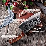 RAZOR SHARP BLADE — Hand-polished 16 degree edge on each side makes the blade ultra sharp, and helps you cutting smoothly with ease. The seamless Full-Tang design prevent the blade from falling easily. The blade is hand-forged with the unique 45 degrees on the top and it’s passed multi-channel composite processes for fine grinding and durability.