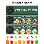 【3 Speed Mode Juicer】 This centrifugal juicer comes with 3 speed modes. “1” is low speed (12000 to 15000 RPM), suitable for soft fruits vegetables like orange, watermelon and others. “2” is high speed (15000 to 18000 RPM), suitable for hard food like apple, beet, carrot etc. “P” is the fastest speed, reach maximum speed instantly and recover after release. Different speeds control maximizes juice yield from various food.