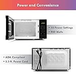 POWER AND CONVENIENCE Countertop microwave has 10 power settings at 900 watts an add 30 seconds button option and a safety lock to keep kids safe