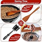 Our meat chopper uses 5 wide beveled pinwheel blades, which can easily chop and crumble food. It gets into the corners of your cookware without scratching the surface. Its the best tool for cooking perfectly browned and crumbled ground beef and turkey, scrambled eggs, and homemade tomato sauce.
