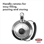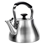 Make tea in style with the OXO Classic Kettle, a traditional-shaped whistling tea Kettle. The Kettle features silicone touch points on the spout cap and handle to help resist heat. Flip the spout cap down to cover the spout and listen for the Kettle to whistle when water is boiling. Then flip the spout cap back to reveal a precise spout that won’t drip while pouring. Turn the handle down to get it out of the way when filling the Kettle or for storage. A large lid opening makes filling and cleaning more convenient. seamless, high-grade stainless steel guards against rust. Do not place in dishwash