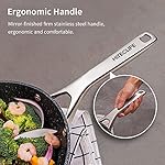 Stainless steel handle for a secure and comfortable grip. Tempered glass lid with steam vent to view food while cooking.