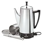 This coffee maker brews up to twelve cups of coffee at a cup-a-minute rate, which it then keeps at a constant, piping-hot serving temperature. An indicator light in the base announces when the coffee is ready. The inner fixtures–the filter basket and perk tube–are also made of stainless steel, rather than the more common (and less durable) aluminum. The power cord is removable to make storage simple.