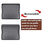 【Double-Sided】- This single cooking device has two faces; one for grilling up burgers, steaks, fish, and bacon; with handy grooves that draw grease away while cooking; and another face for griddling eggs, pancakes, tofu, stir-fry, and more! Double-sided griddle combo lets you griddle breakfast, then flip it over and grill dinner. Maximize space, time, and effort with this two-in-one Cast Iron Grill/Griddle