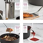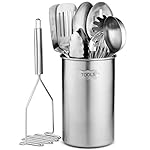 EVERYTHING YOU MIGHT NEED – 10-piece modern nonstick stainless-steel utensils. Includes basting spoon, slotted spoon, square slotted turner, ladle, skimmer spoon, potato masher, whisk, spaghetti spoon, and tongs, in addition to a sleek utensil holder to keep it all organized.