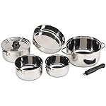 Ranging in size from 1-quart to 4-quarts, the four pots make outdoor cooking a breeze for groups of all sizes. Also included is a 10″ fry pan, perfect for omelets and stir-fries. The universal lid covers each item for simmering soups and stews. The universal handle is interchangeable with all but the 4-quart pot, which has its own handles. All of the items nest together for easy carrying and storage of the entire set. Set Includes: 4 qt. Pot, 3 qt. Pot, 2 qt. Pot, 1 qt. Pot, 9.75″ Frypan, 8.75″ Universal Lid and Universal Handle.