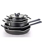 Set includes: 12 inches Fry pan with pour spouts, 11 inches Deep sauté with pour spouts, 1. 5 qt Saucepan with lid, 3 qt Saucepan with lid, 5 qt Dutch oven with lid, 1. 5 qt plastic lid, 3 qt plastic lid