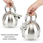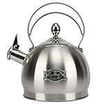 This LUXGRACE 2.6 quarts whistling stainless steel stovetop kettle is crafted of high quality stainless steel. Whistles when boiling, can be used on gas, electric, induction, halogen, and radiant stovetops. The tea pot heats up quickly and retains heat well. Encapsulated bottom provides even heat distribution. Convenient trigger mechanism on the handle allows for the safe and easy pour. Removable lid for easy filling and convenient one finger flip spout for easy and safe pouring.The metallic color on the kettle body, this sophisticated design tea pot is also perfect embellishment for your kitchen.