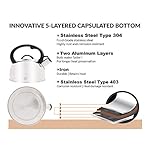 OUR TEAPOT STOVETOP HAS 5-layer BASE which HEATS UP WATER FAST and RETAINS HEAT – inner bottom food-grade stainless steel, iron between two aluminum layers, and a induction friendly stainless steel in the outer bottom; – YOU WON’T WAIT TOO LONG