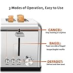 √ Smart Toaster—Dual independent cancel, defrost and bagel buttons with LED indicators. 6-settings brown shade from 1 (light) to 6(dark). High lift lever automatically pop up and shut-off allowing easy remove of all kind of bread. Cancel function allows you to end toasting at any time. Bagel function toasts cut side of bagels. Defrost function efficiently thaws and toasts frozen bread.