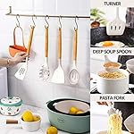 ✅24 DURABLE WOODEN HANDEL KITCHEN UTENSILS SET – Anti scalding protect your hand from burning, 24 professional silicon Kitchen utensil set includeshe set includes flexible spatula, soup ladle,serving spoons pasta server, spatula turner , tongs, mesuring cup and spoons, 10 hooks, silicone mat and so on. Meet your all kinds of kitchen needs