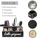 【RUSTIC YET ELEGANT HAIR TOOL ORGANIZER】: Designed with rustic white surface and cute HELLO GORGEOUS saying, the hair dryer holder organizer makes a stylish addition to your vanity table or bathroom counter. The stainless cups is perfect to cool hot curling iron tools and blow dryer, It is the best choice as vanity organizers and bathroom accessories holder.