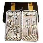 Specification: Y.S. organize Professional Manicure Travel Set for Men and Women. 12 Pieces kit of Stainless Steel Manicure & Pedicure Tools. Nail Clippers and Grooming Kit in an Beautiful Gold Metallic case