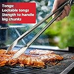 CONVENIENT DESIGN-Outfitted with a hanging loop on each handle and lock tongs for convenient storage. Slotted spatula with bottle opener features serrated edges for cutting and tenderizing meats. The head of the tongs has a narrower gap to provide a multi-point contact that can pick food up easily without tearing.